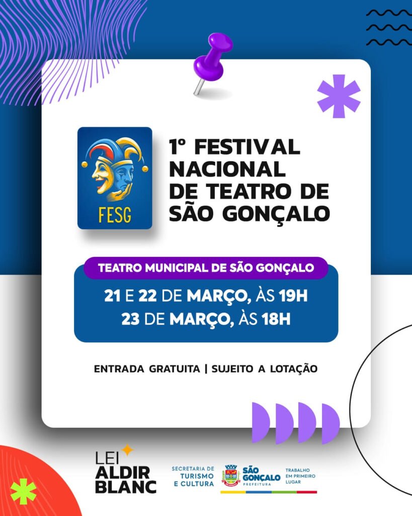 O primeiro Festival Nacional de Teatro de São Gonçalo (Fesg), um evento cultural inovador e gratuito, vai acontecer a partir desta sexta-feira (21) até domingo (23/3), no Teatro Municipal de São Gonçalo, sempre a partir das 18h30min.
