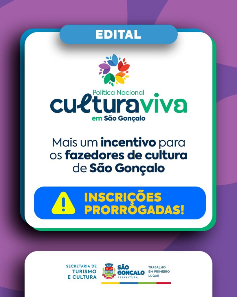 A Prefeitura de São Gonçalo, por meio do Fundo Municipal de Cultura, informou que o prazo de inscrições do Edital Cultura Viva foi prorrogado até 30 de abril de 2025, às 23h59min. O edital convida coletivos e entidades culturais sem fins lucrativos para se inscreverem, com o objetivo de reconhecer e premiar ações culturais, como os pontos de cultura da cidade.