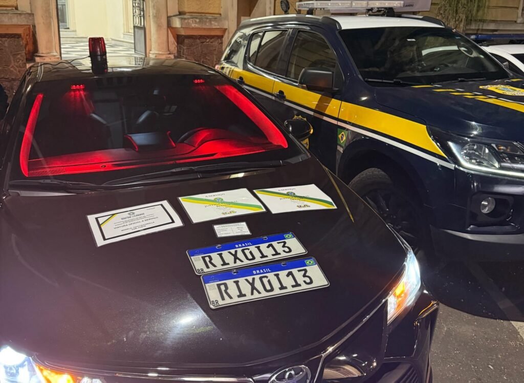 O carro possuía sirene, estrobo e giroflex instalados. A placa original do veículo estava guardada no porta-malas. Além disso, foram encontradas credenciais falsas de trânsito livre.