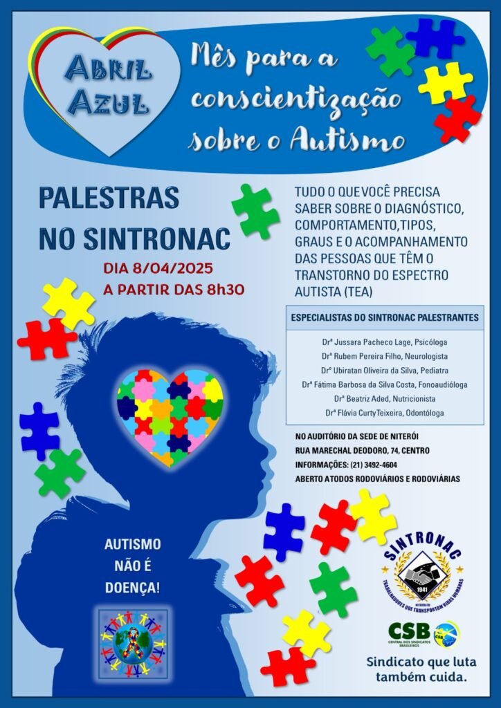 O Sindicato dos Rodoviários de Niterói a Arraial do Cabo (Sintronac) vai promover, na próxima terça-feira (8/4), a partir das 8h30min., uma série de palestras sobre o Transtorno do Espectro Autista (TEA).