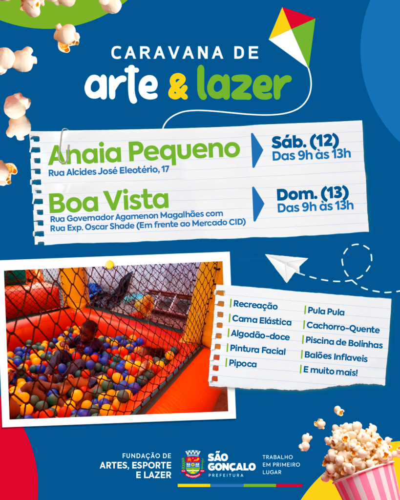 A Caravana de Arte e Lazer vai oferecer alegria e diversão aos bairros Anaia Pequeno e Boa Vista neste fim de semana. No sábado (12), os moradores do Anaia Pequeno vão poder aproveitar o evento e, no domingo (13), as atividades vão acontecer no Boa Vista. A caravana acontece das 9h às 13h.