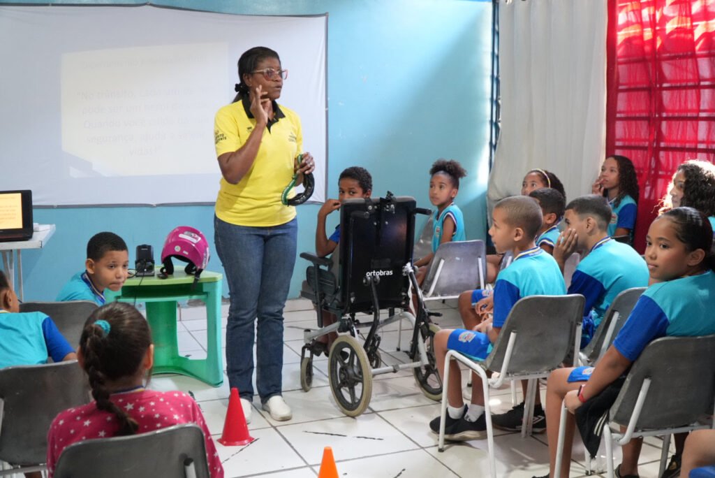 Além disso, ao final da aula, os alunos ganham um jogo com placas de trânsito e uma revista com temas ligados ao trânsito.