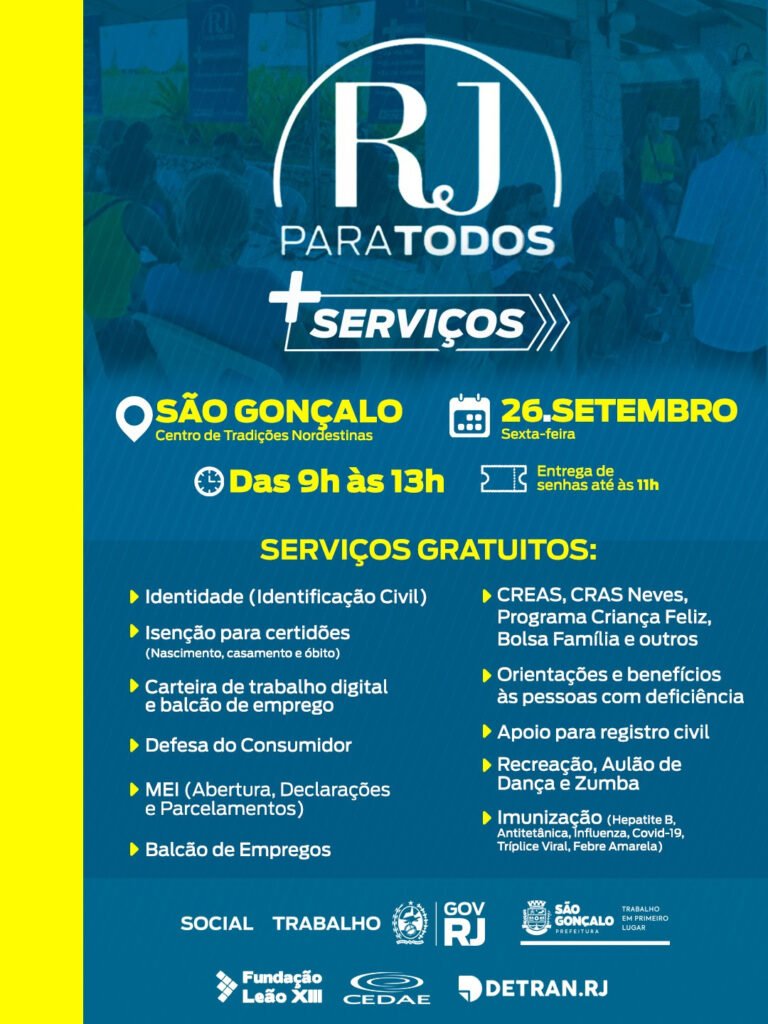O Centro de Tradições Nordestinas “Severo, Embaixador Nordestino”, em Neves, vai receber, nesta sexta-feira (26), o Programa RJ para Todos, da Secretaria de Governo do Estado do Rio de Janeiro. A ação será desenvolvida em parceria com a Secretaria de Desenvolvimento Econômico da Prefeitura de São Gonçalo. O RJ Para Todos vai acontecer de forma gratuita, das 9h às 13h, com distribuição de senhas até às 11h.
