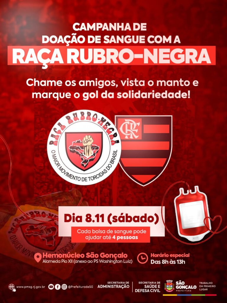 A Prefeitura de São Gonçalo, por meio da Secretaria de Administração, em parceria com a Torcida Organizada Raça Rubro-Negra, vai realizar uma Campanha de Doação de Sangue no Hemonúcleo de São Gonçalo, no dia 8 de novembro.