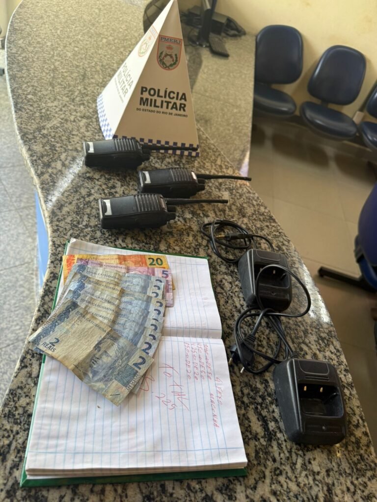 Com ele foram encontrados R$ 45,00 em espécie e, próximo ao local, um caderno com anotações do tráfico. Gabriel confessou atuar como olheiro, disse que recebia R$ 500,00 por semana, e informou possuir rádios comunicadores em sua residência, na Rua Maré Mansa, onde foram apreendidos três rádios e dois carregadores.