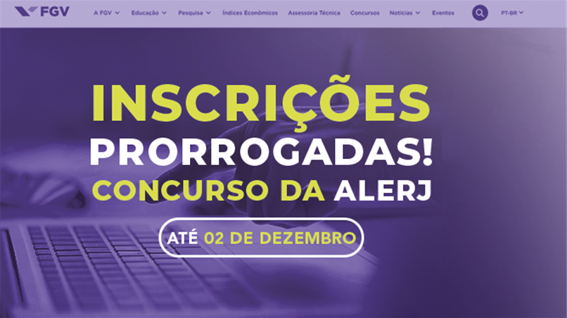 As inscrições para os cargos de especialista legislativo III (nível médio) e IV (superior), do concurso público da Assembleia Legislativa do Estado do Rio de Janeiro (Alerj), destinado ao preenchimento de 101 vagas, foram prorrogadas até o dia 02/12, com data limite para pagamento do boleto até 03/12. O comunicado teve sua divulgação feita pela Fundação Getúlio Vargas (FGV), banca responsável pela organização do certame.