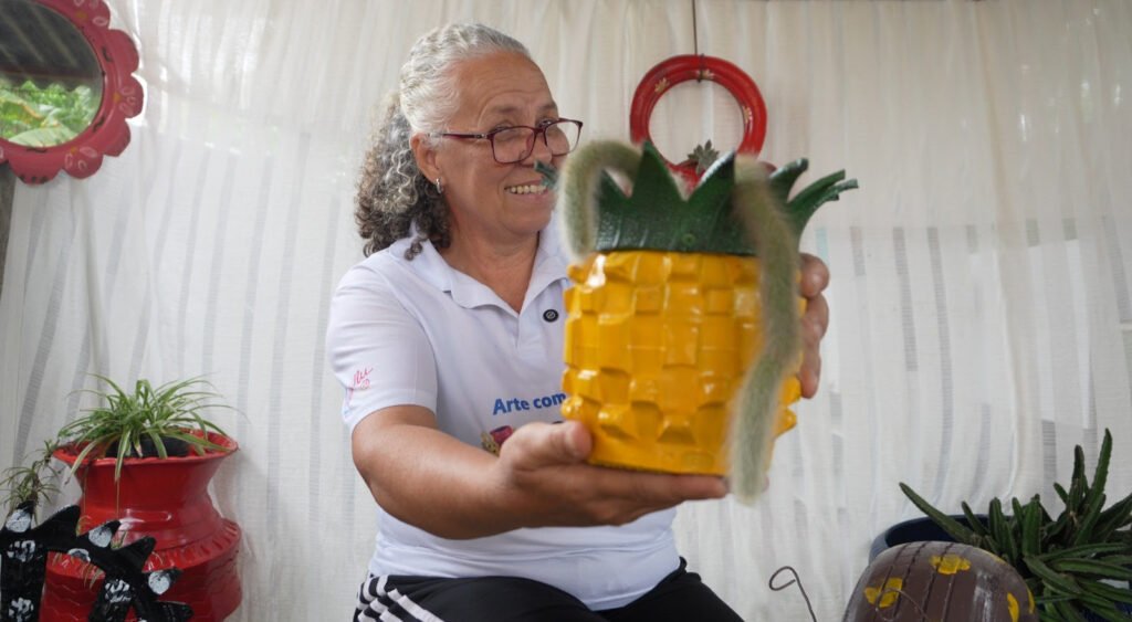 Moradora do bairro Monjolos, a artesã Adriana Asta, de 57 anos, conheceu a produção de artes com pneus reciclados e começou a praticar, após passar por um problema de saúde. Com apoio do seu marido, Luciano Agnelo, 50, Adriana soube do Lidera Mulher e virou a chave de sua vida.