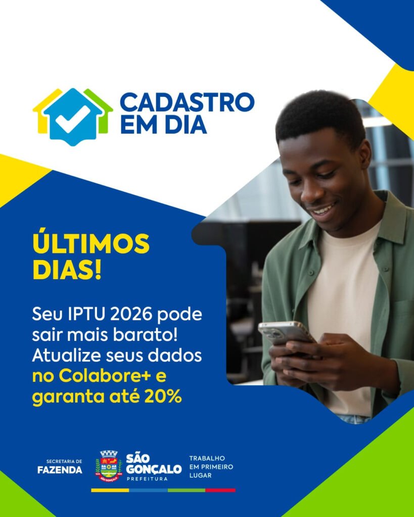 A Prefeitura de São Gonçalo, através da Secretaria de Fazenda, lembra aos contribuintes que faltam poucos dias para encerrar o Programa Cadastro em Dia, que garante o benefício de 5% de desconto no IPTU 2026, caso os mesmos atualizem os dados dos imóveis até o dia 30 de novembro deste ano. Somando ao programa Bom Pagador, o imposto poderá ter uma redução total de até 20% para quem realizar o pagamento em cota única.