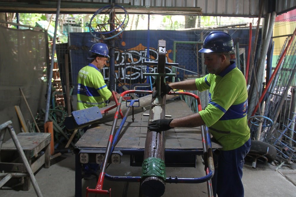 É no Horto Municipal, localizado no bairro Água Mineral, que profissionais de serralheria e carpintaria realizam reparos em brinquedos e bancos de madeiras danificados.