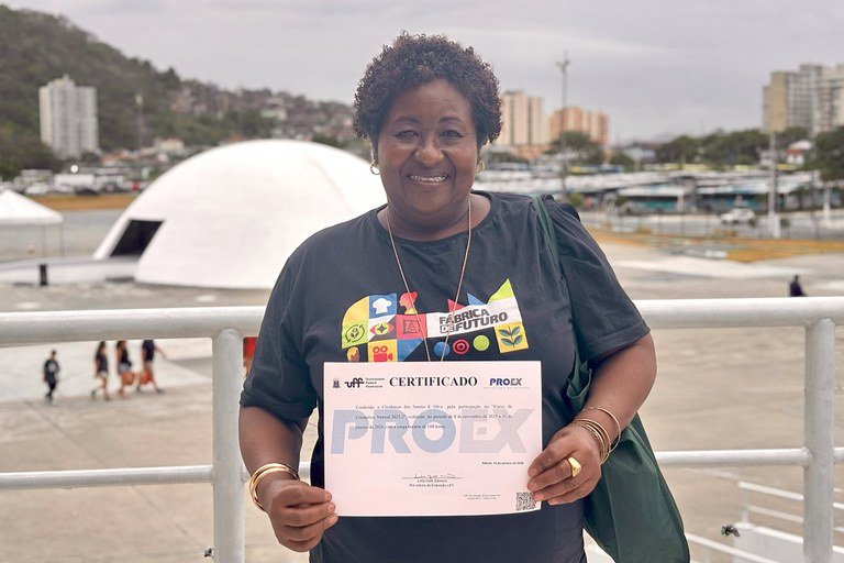 Ela faz parte dos 500 alunos que receberam a certificação de cursos profissionalizantes do projeto Fábrica de Futuro, nesta terça-feira (20.01), em Niterói. A cerimônia contou com a participação do ministro Wellington Dias, da ministra da Igualdade Racial, Aniele Franco, e do reitor da UFF, Antônio Nóbrega.