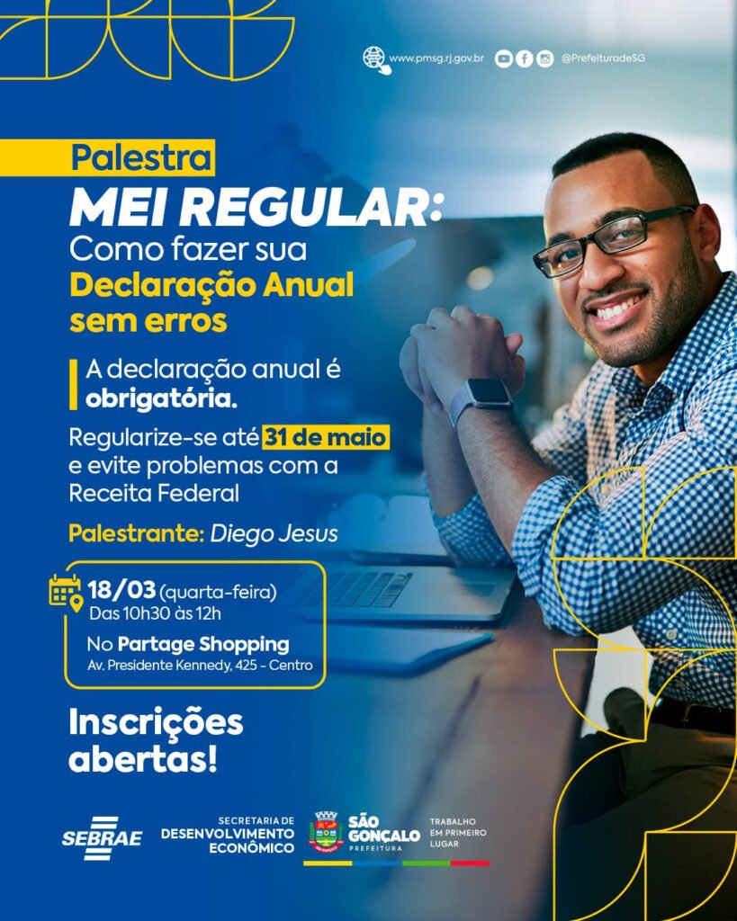 Palestra “MEI Regular: Como fazer sua Declaração Anual sem erros”, no dia 18 de março de 2026, das 10h30 às 12h30, com Alexandre Nardi, no Espaço mais Conhecimento, no 2ª andar do Partage Shopping, localizado na Avenida Presidente Kennedy, nº 425, Centro, São Gonçalo.