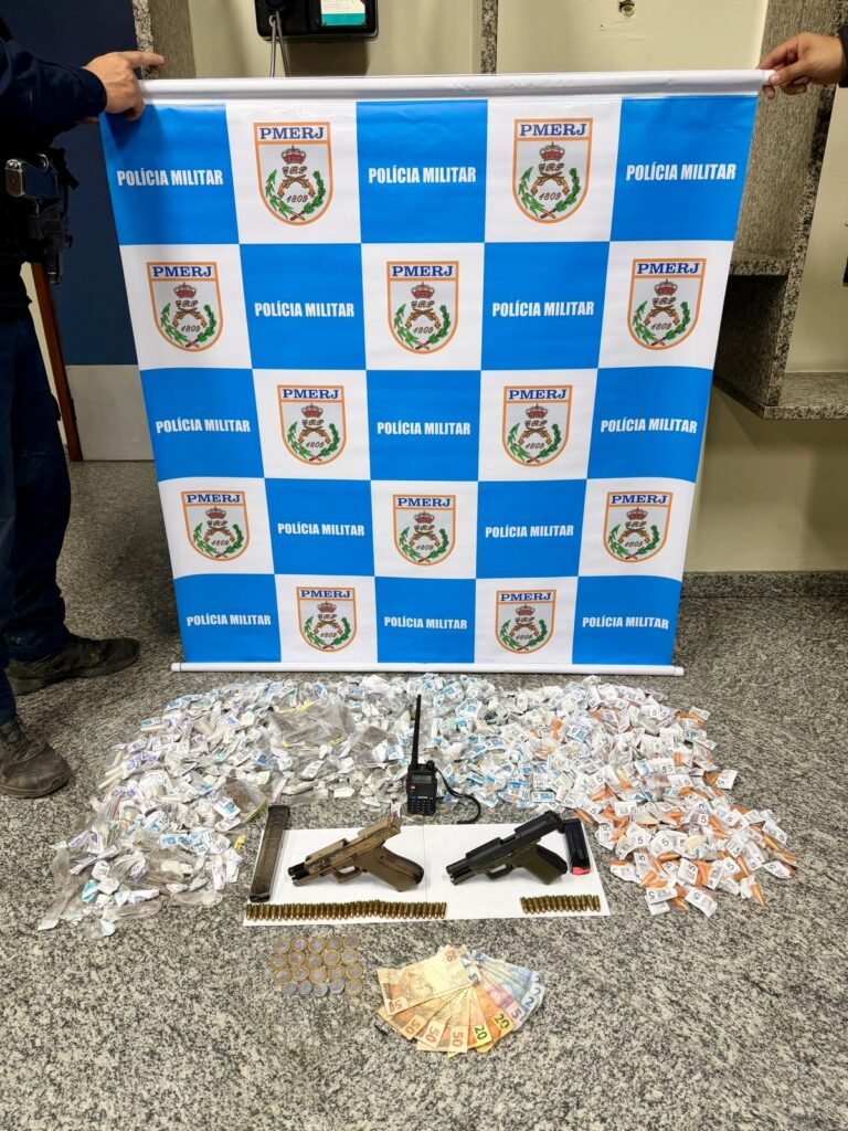 Um criminoso foi preso e duas pistolas calibres 9mm foram apreendias, além de um rádio comunicador e grande quantidade de drogas, neste sábado (11/04), durante ação dos policiais do 12ºBPM, realizada na Comunidade do Caramujo, na Zona Norte de Niterói.